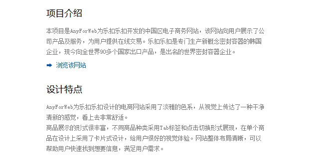 在AnyForWeb網站案例頁面中,標題使用18號的微軟雅黑,正文使用12號的宋體,兩種字體字號的對比讓文字內容富有層次,很容易吸引讀者眼球。